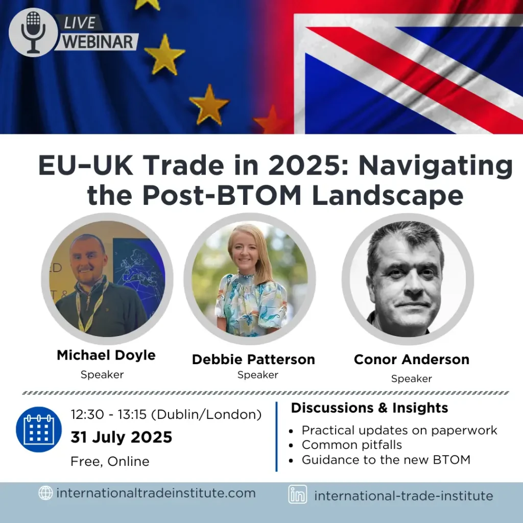 EU-UK Trade in 2025: Navigating the Post-BTOM Landscape 31 July 12:30 (GMT+1) Free 30-min Webinar Brexit might be out of the headlines, but for exporters and logistics professionals, the reality of moving goods between the EU and the UK is still very much alive, especially with the UK’s Border Target Operating Model (BTOM) coming fully […]